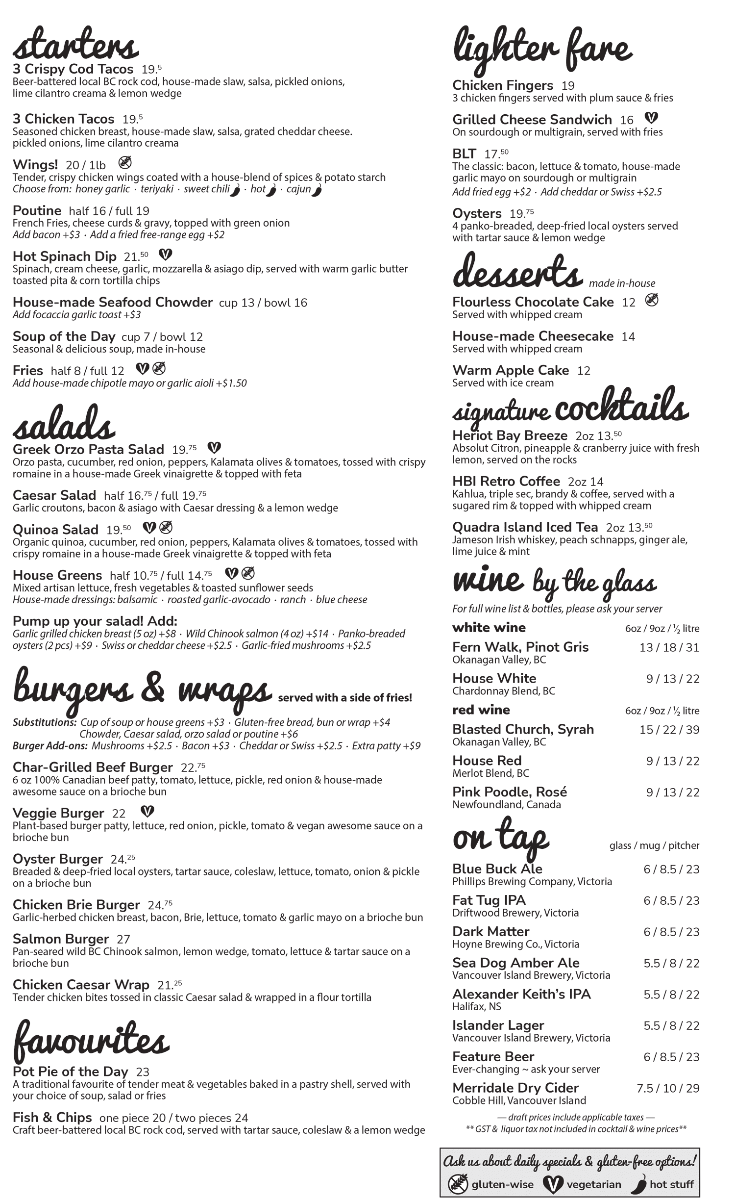 Yes, that’s what you find when you walk up the steps into the HBI Pub. Adding to the marine view from the covered deck, you’ll also find locals enjoying the great beer on tap, seasonal sports events on the big screen, friendly staff, a pool table & darts.